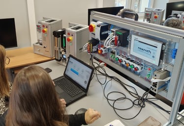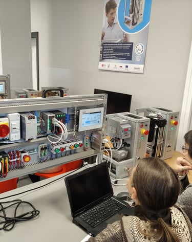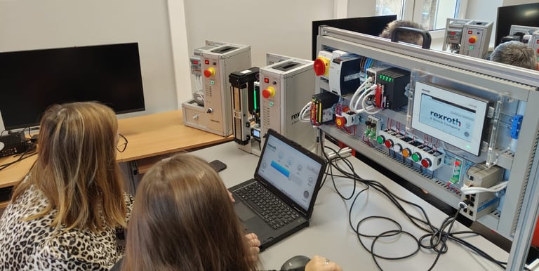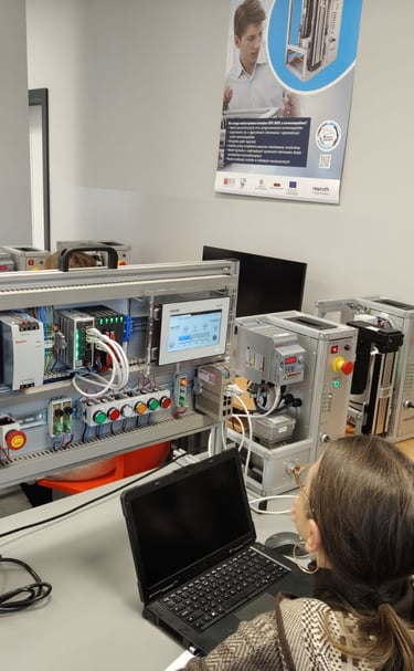 Uczestnicy programują sterowniki PLC i systemy HMI, rozwijając praktyczne umiejętności.